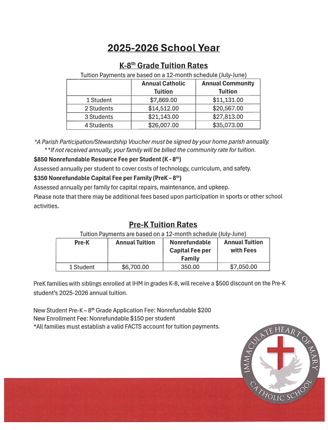 At Immaculate Heart of Mary Catholic School, we are committed to making our programs as accessible as possible. Our tuition rates are designed to be competitive while maintaining the exceptional standards of academic excellence and spiritual formation that define our school community.
